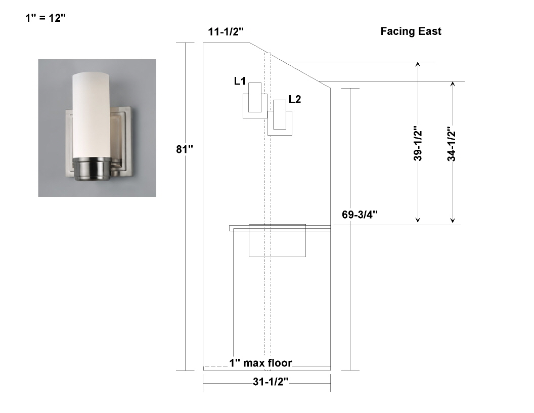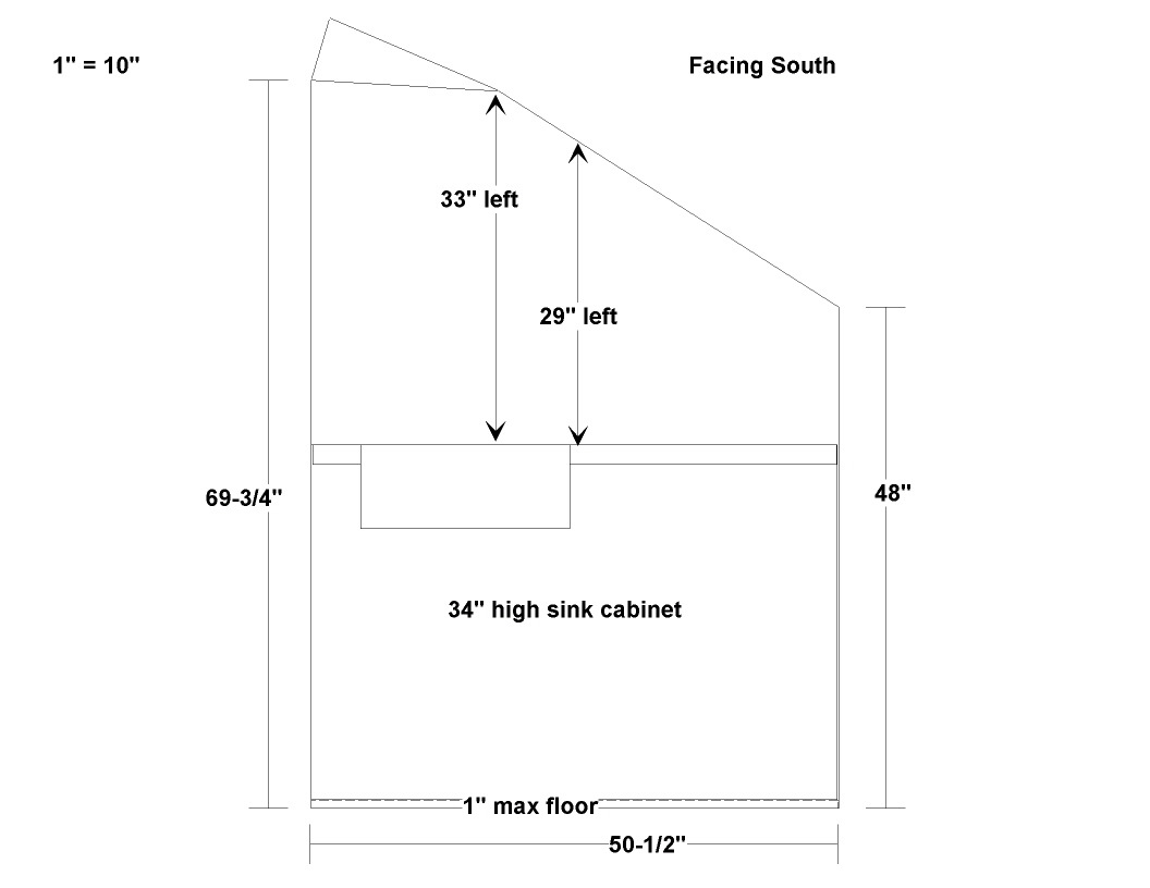 Nav This is the attic bathroom sink wall facing South. The shower is on the left.
