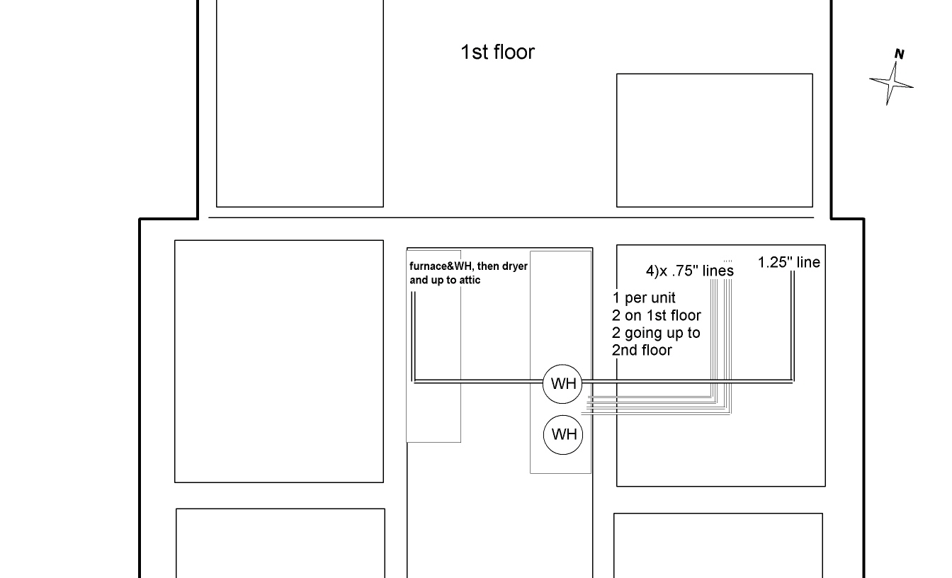 W1 - 3/4" supply; one T to 40000 btu water heater, inline to 6000 btu corner heater.