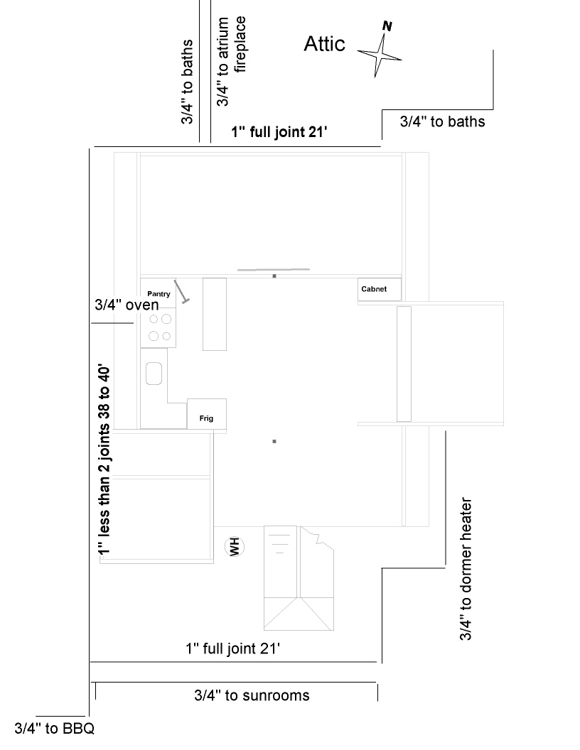 2nd T to 3/4" inline to Attic LvRm 18000 btu wall heater.