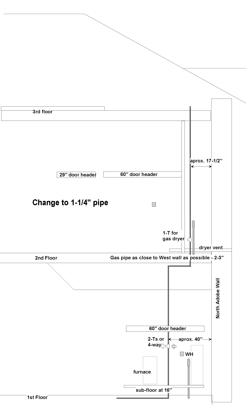 E2 - 3/4" supply; one T to 50000 btu water heater, inline to 6000 btu corner heater.