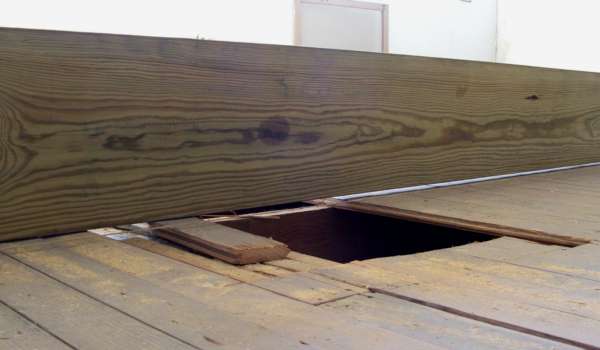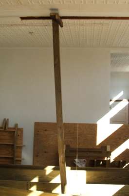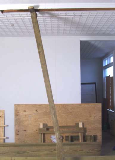 Remember the string line was 1-5/8s over the floor. That is a long way to go! I have tweaked my back a little. Not from the job, but from moving the 100Lb. 2x12s around (dragging them upstairs and I had to move them around the floor here to get the A-frame in the right place. Just a minor pain, so I'll be careful.