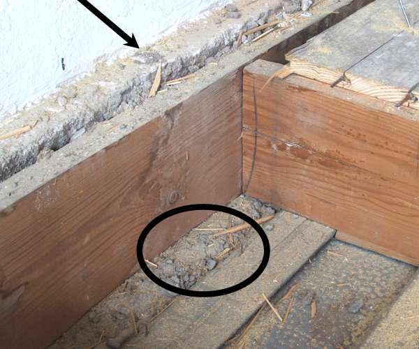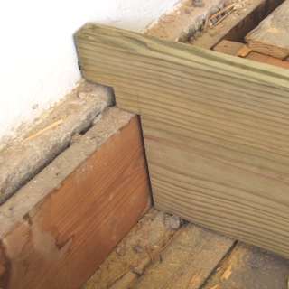 | The arrow is pointed to the ledge that I'd mentioned earlier after removing a some of the floor a couple weeks ago. More recently, when measuring to cut the beam, I discovered this second ledge that the joist end is setting on. That means this west wall, the part that's connected to the Judd building is much thicker than first realized...and changes the measurement that I'd taken downstairs. This probably means that the divider wall (corridor wall) is indeed exactly over the downstairs wall. (Below) I wanted to fit the beam in for maximum strength, so the cuts on the ends needed to be complex, but as you see....no prob. | |