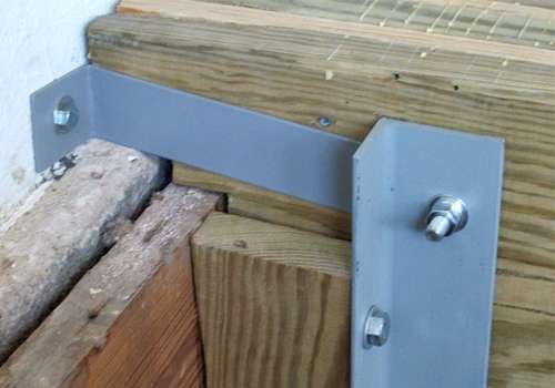 | The steel "L" bracket is held to the beam by the bolt going thru the joist support. |