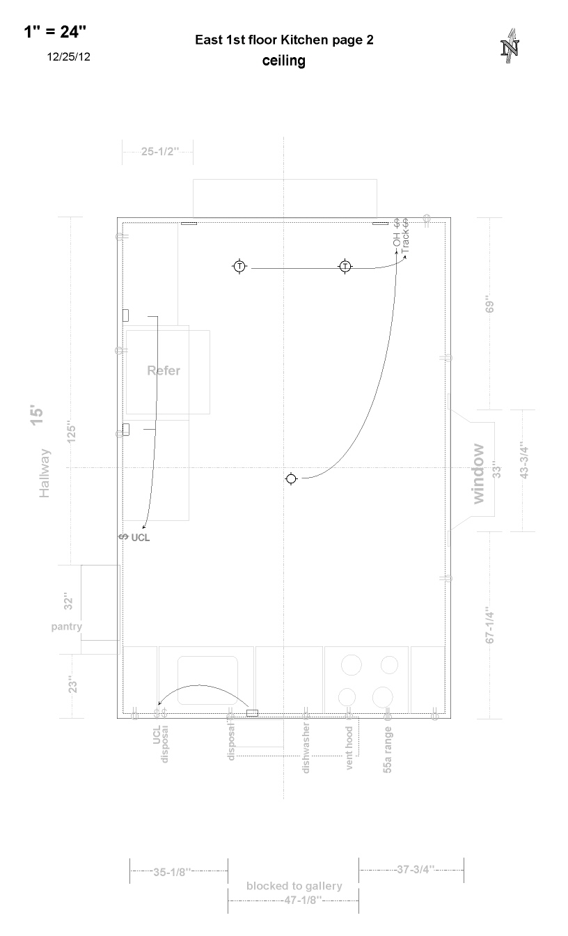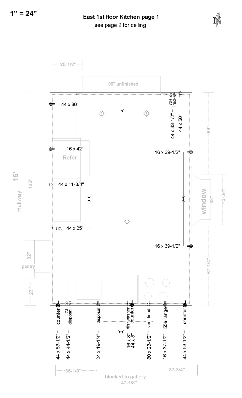 | E1 South wall E1 from center to West Counter outlet = 44 x 53-1/2 ucl/disposal switches = 44 x 44-1/2 disposal outlet 24 x 19-1/4 E1 from center to East dishwasher outlet = 16 x 8 vent hood outlet = 80 x 23-1/2 220 Range outlet = 16 x 37-1/2 Counter outlet = 44 x 53-1/2 E1 West wall E1 from center to South UCL switch - 44 x 25" from center to North Counter outlet = 44 x 11-3/4" Refer outlet = 16 x 42" Counter outlet = 44 x 83" E1 North wall from center to East overhead lighting switch = 44 x 42-1/2" wall outlet = 16 x 51-1/2" E1 East wall from center to North wall outlet = 16 x 39-1/2" from center to South wall outlet = 16 x 39-1/2" Ceiling boxes Octagonal Track lighting from unfinished North wall = 17-1/2" center to West = 16", center to North = 72-1/2" center to East = 22", center to North = 72-1/2" Rectangular for under cabinet lighting West wall UCLx2 on 1 switch 14" North of center line 55" North of center line South wall UCLx1 on 1 switch 11-1/2" West of center line |