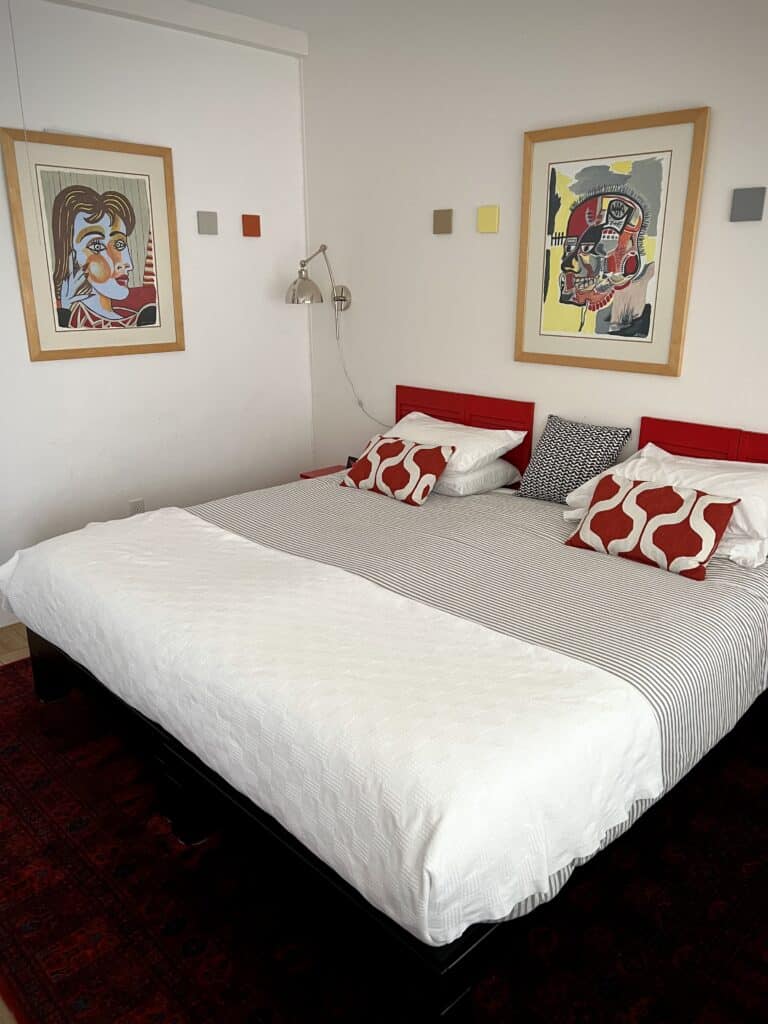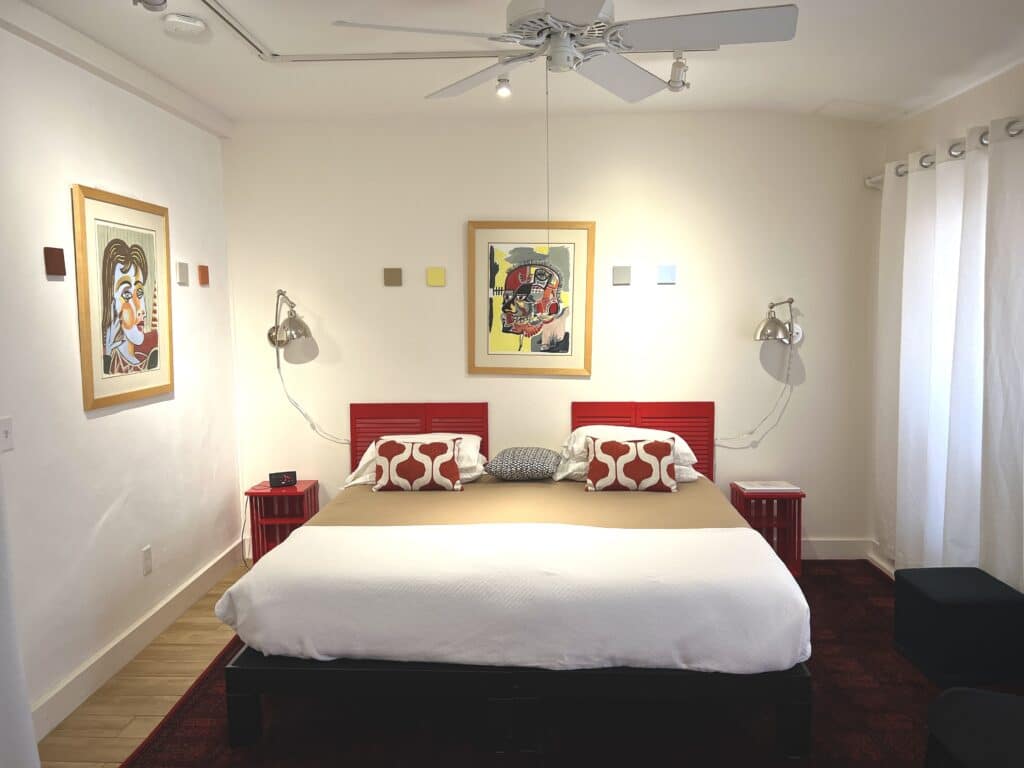 Rio Concho has a ceiling fan and efficient mini split heating and cooling with remote control, as well as a small gas fireplace. Guests of Rio Concho also have access to the Marfa House rear screened atrium with its large-screen TV, and to the gallery seating area on the first floor. Rio Concho can be booked for $115 per might Sunday through Thursday, and $125 per night on Friday and Saturday nights. A one-time $50 cleaning fee is charged per booking, together with state and local hotel occupancy taxes totaling thirteen percent.