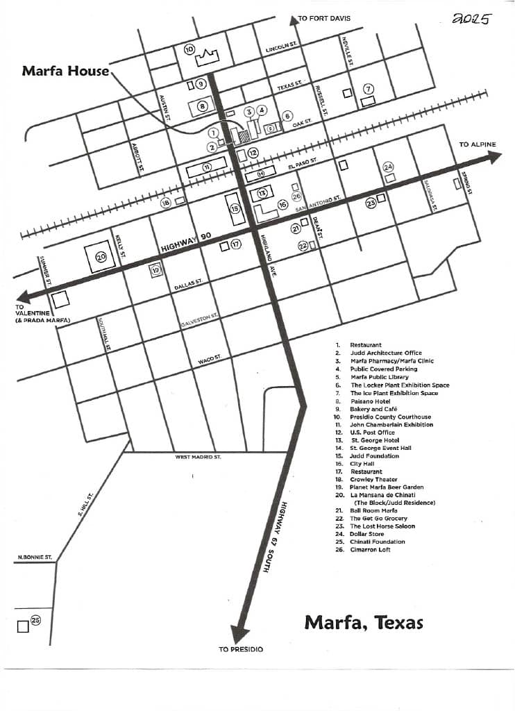 Turn north from State Highway 90 at the blinking traffic light, proceed up Highland Avenue toward the Presidio County Court House, but turn right on Oak Street after crossing the railroad tracks. Marfa House is located across from the U.S. Post Office and next door to the Marfa Country Clinic. Street parking is available.